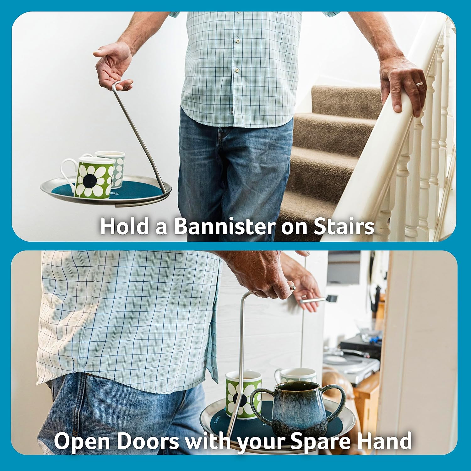 A new and improved design based on the original tray from One Hand Products. Harness the magic of physics and serve drinks one-handed! Free up one hand for stair rails, door openings, or canes