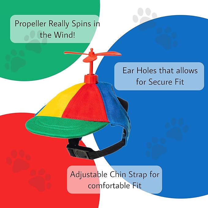 This funny dog hat comes with a fully functional propeller that spins easily in the wind and when pushed. This hat comes with 3 propellers for maximum rotation